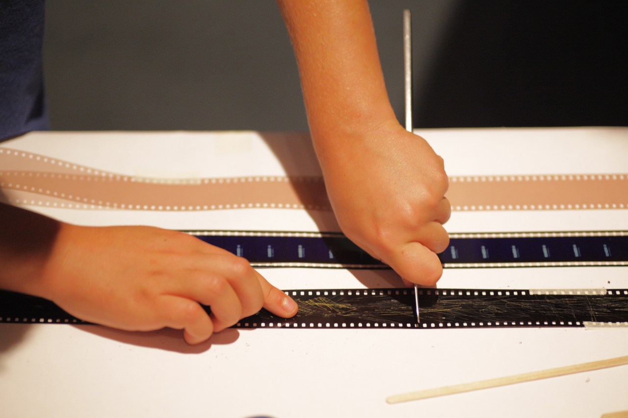 Children were invited to scratch, scour, and scrape away the black emmulsion on 35mm black leader and doodle, smudge and pattern with paint and felt tip pens on clear 35mm leader. When played back through the projector their patterns came alive, dancing across the screen, as in this wonderful video documentation of the workshop shows. The workshop was inspired by the early experimental films of Len Lye.