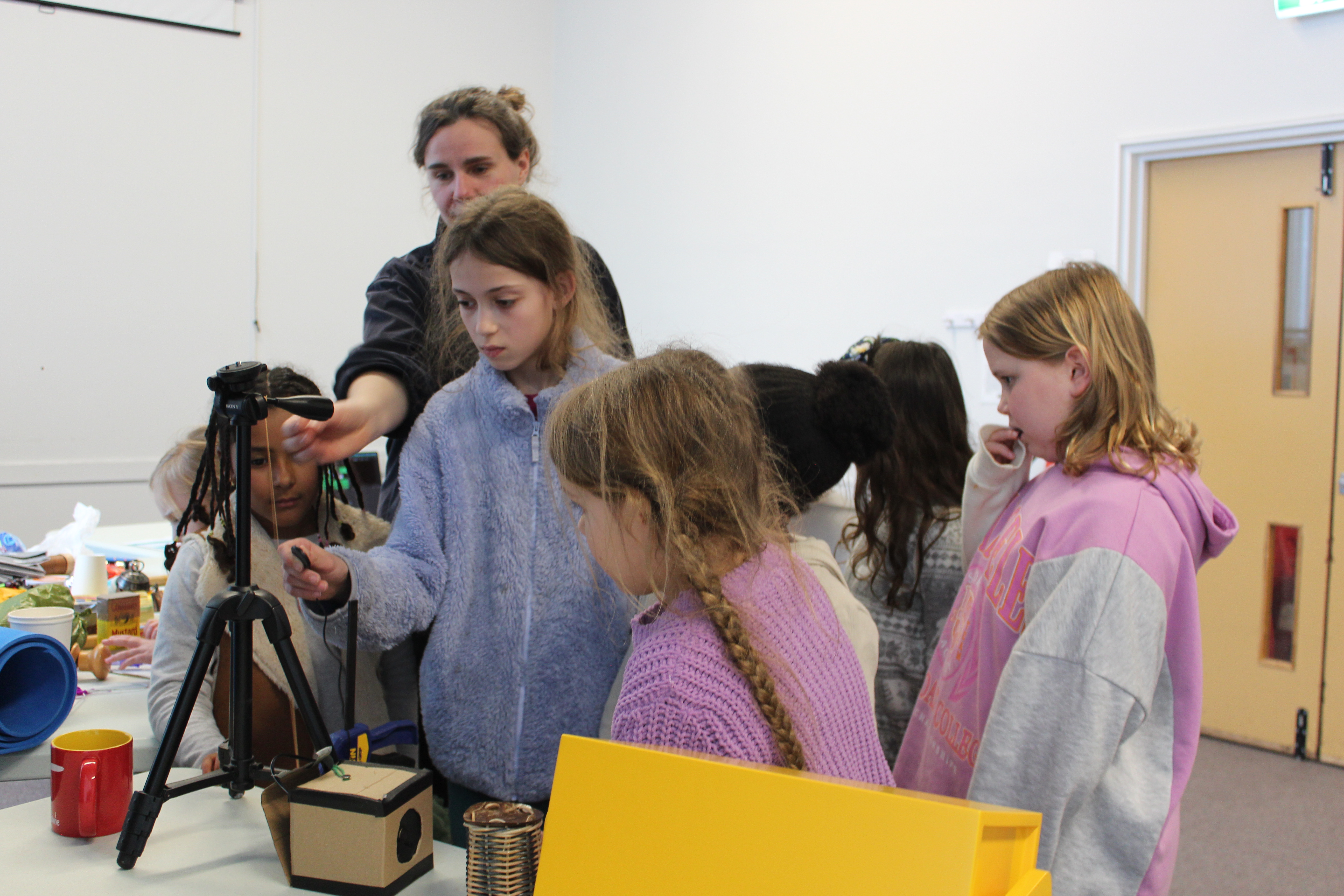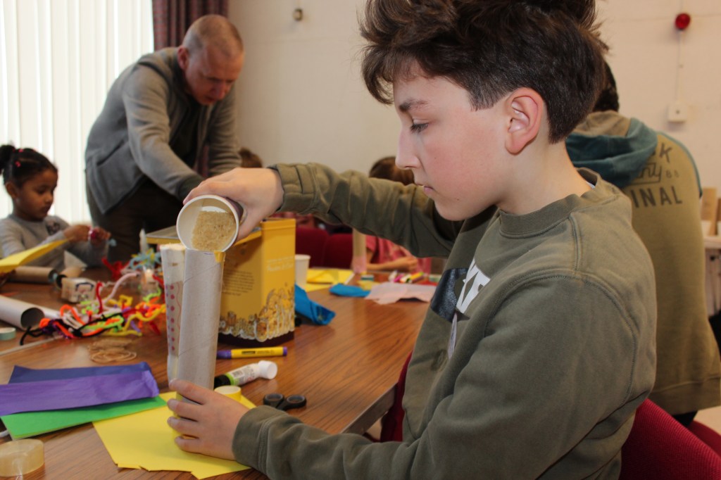 During the workshop the children used props; coconut shells, tin foil, cling film, swanee whistles, shakers, phonebooks and my sound effects contraptions to record and layer up sounds using iMovie and design sound scapes for film stills, such as a swamp, a Jurassic landscape, and a forest with horses. They also made their own rainsticks from cardboard tubes and rice and kazoo squeekers with elastic bands and lolly sticks. We also tried a live foley play-along to the Disney’s Silly Symphonies The Old Mill (1937) with the whole audience and recreated the sounds of the rain, wind, owls, lighting, thunder with our hand-made rainsticks.