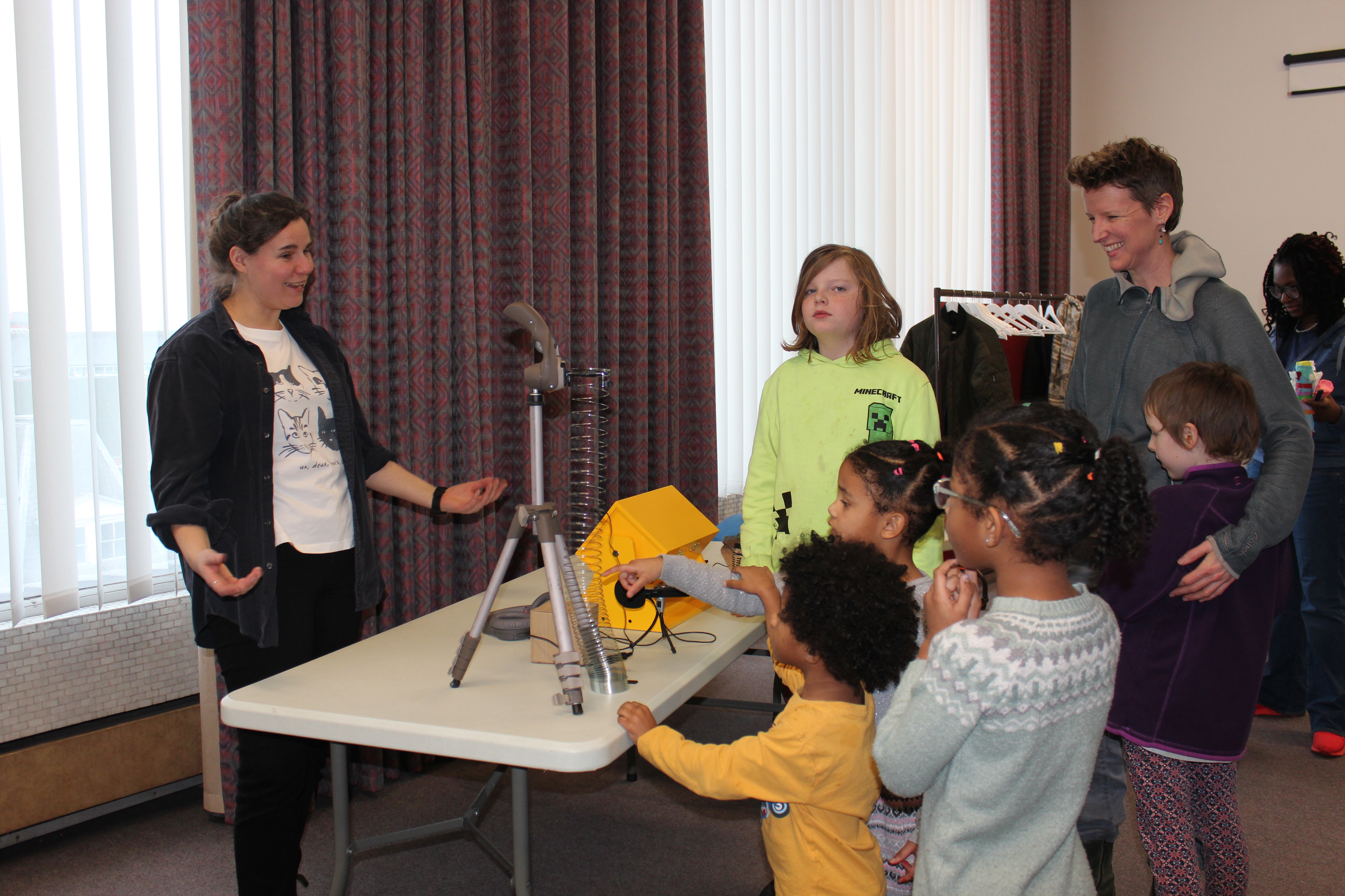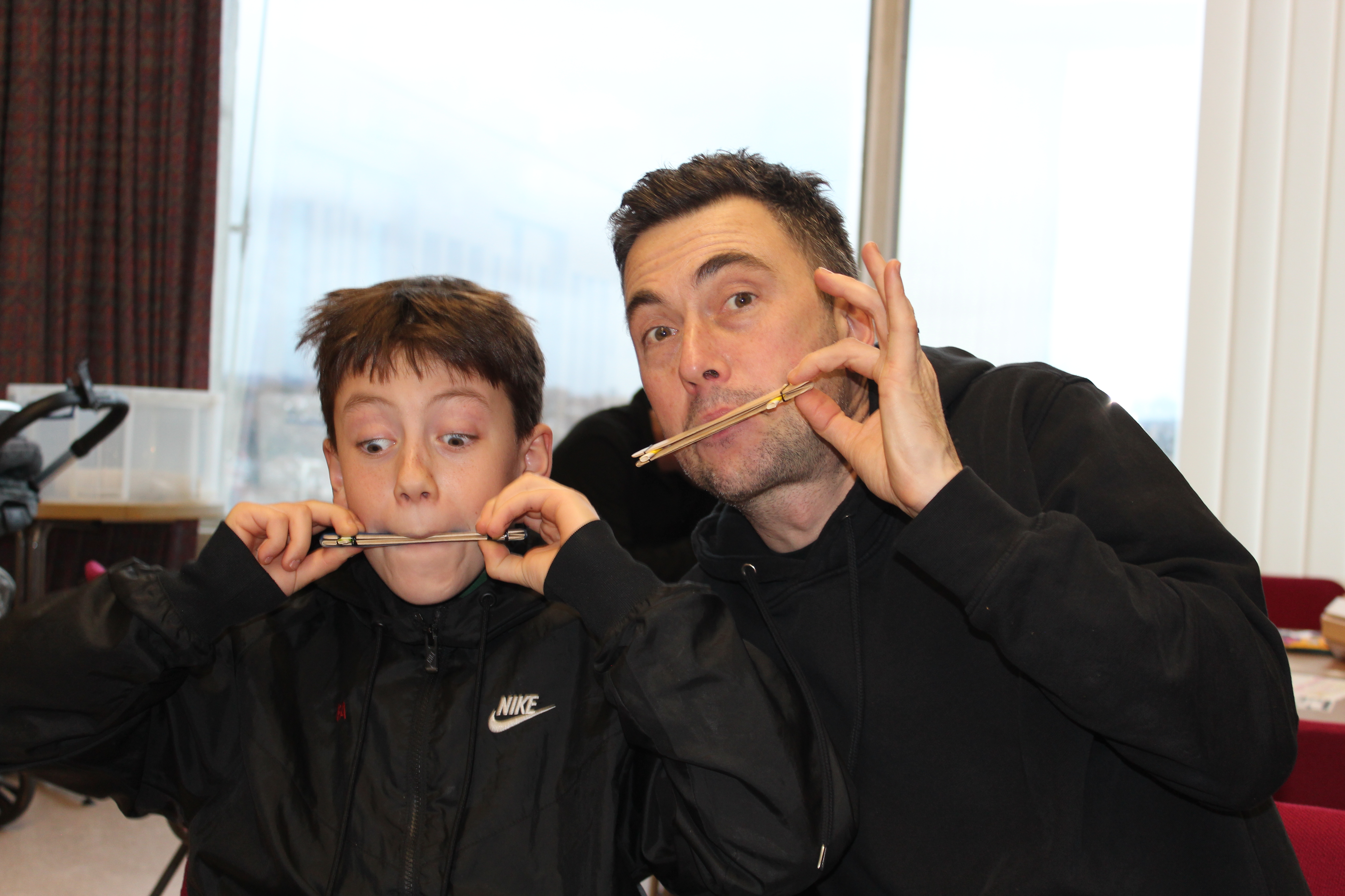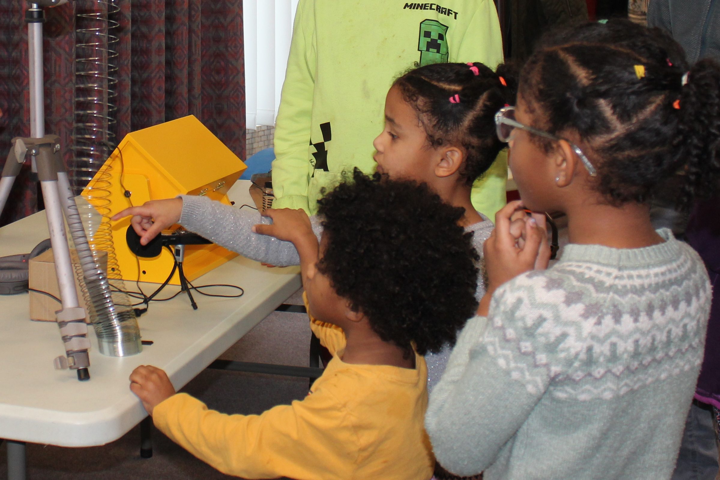 For the workshop I created three sound effects contraptions for participants to experiment and play with; a rain machine made from a yellow tombola, a stretched elastic band and a slinky. Once hooked up to a contact mic and a homemade mono amp and speaker the slinky made the sound of a ray gun and the elastic band made the sound of a creaky door and croaking frog.