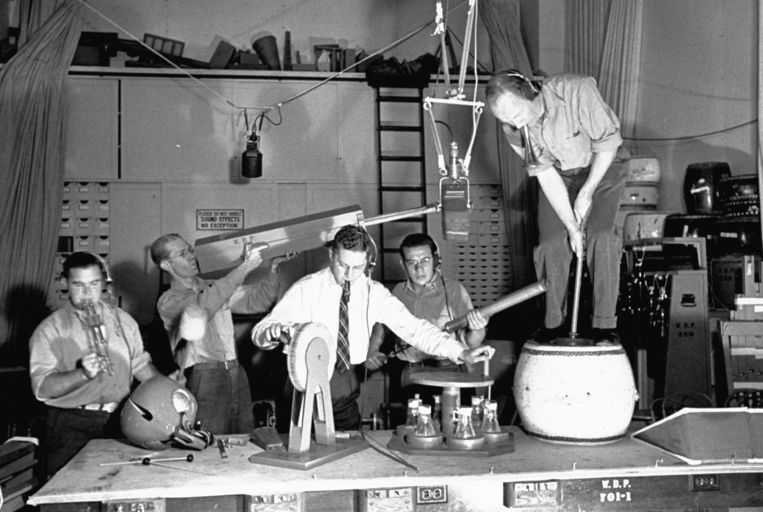 Disney’s sound effects department was formed in the early 1930s, headed by Jimmy MacDonald who became the second voice of Mickey Mouse from 1946 until 1977. MacDonald and his team pioneered over 500 sound effect contraptions. These included wind and rain machines, as well as creating the sound of a car using glass jugs and a frog using a bow and string.