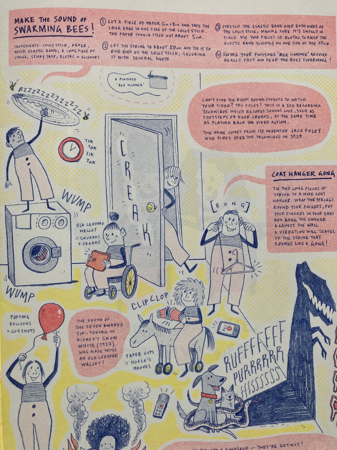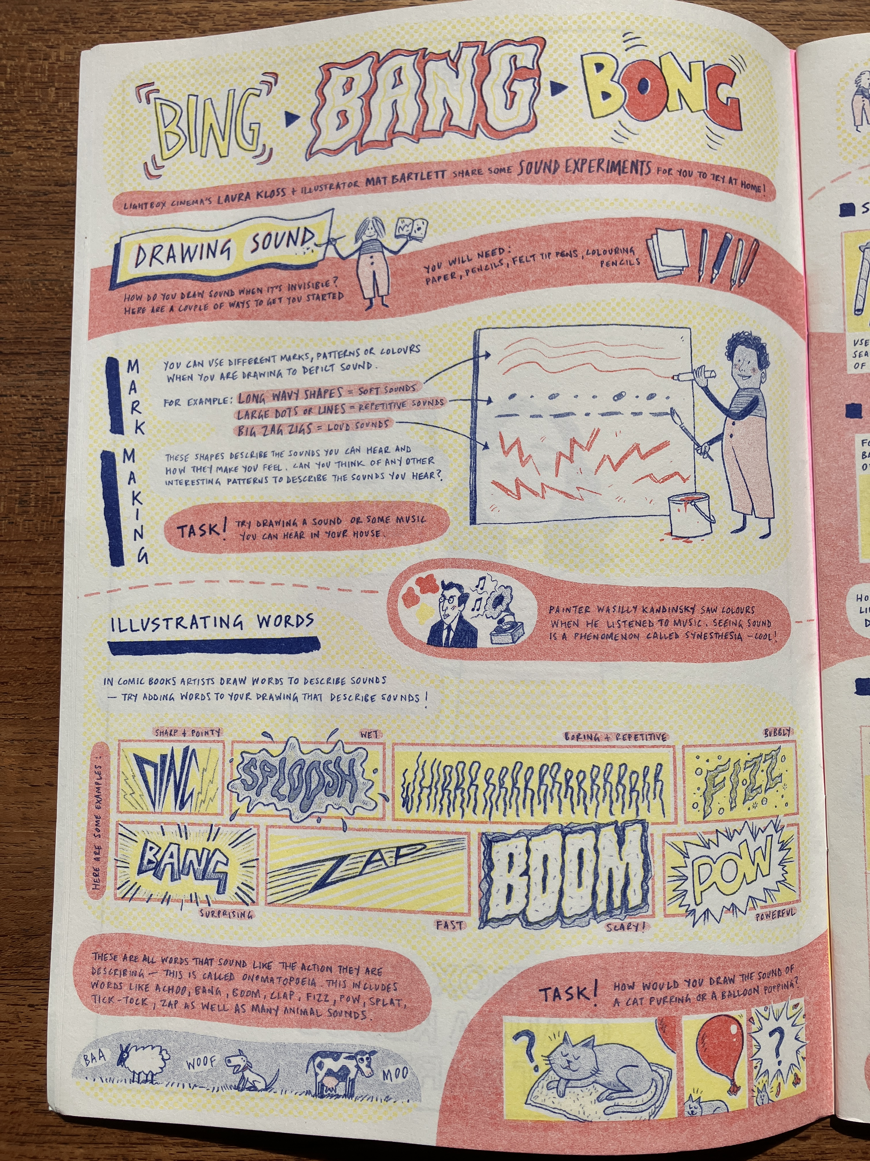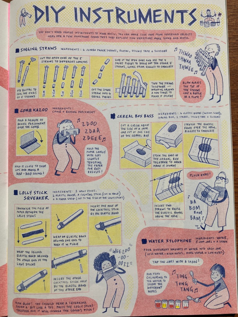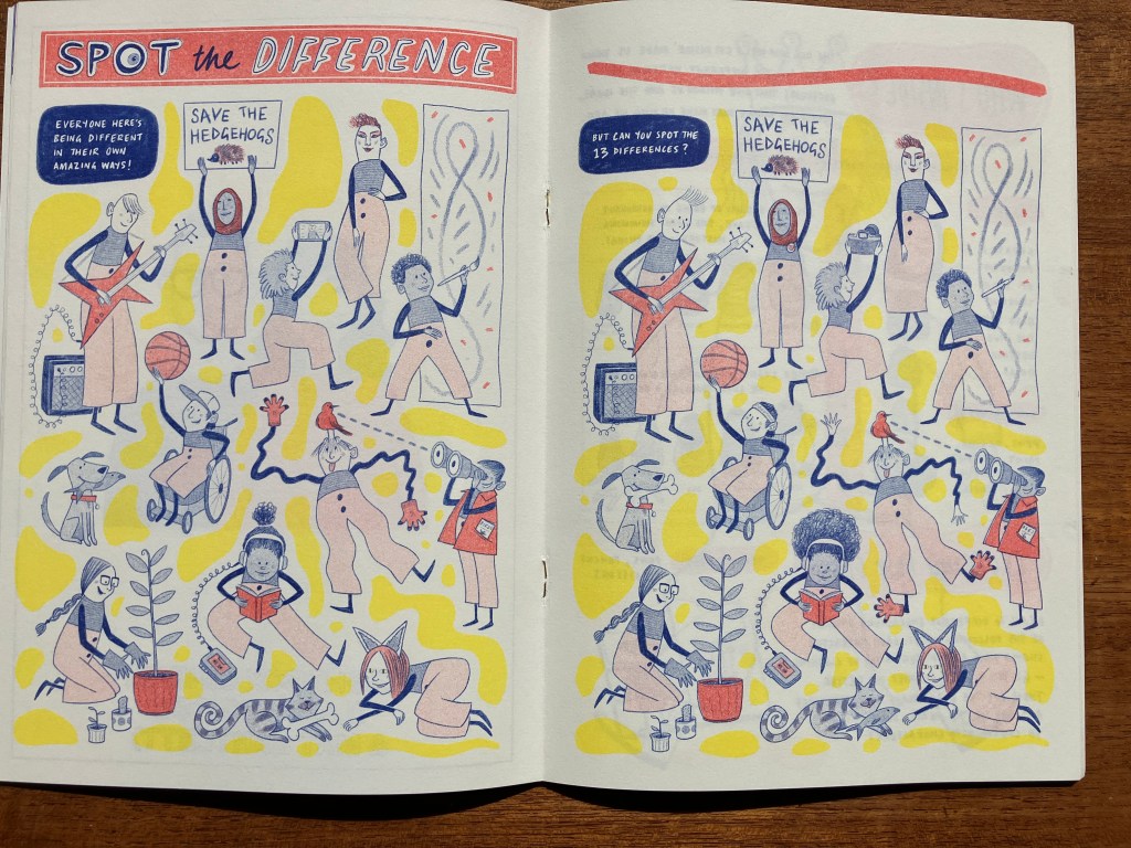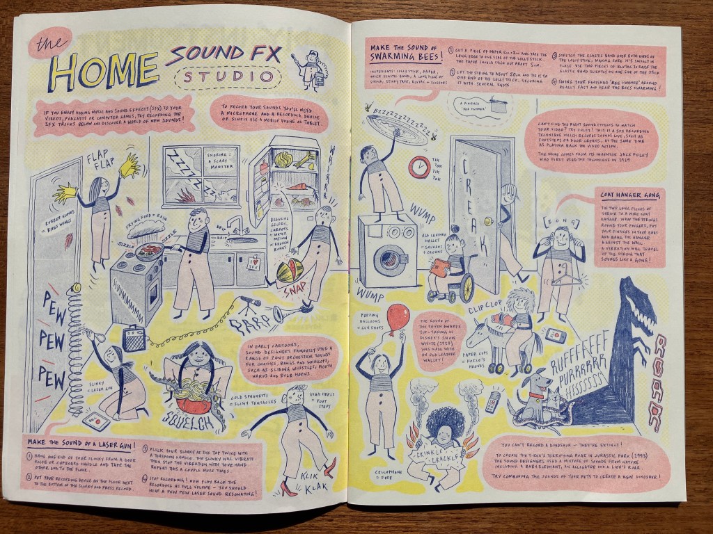 Flatpack Film Festival commissioned us to produce eight pages of activities for two family zines ‘Sound & Vision’ and ‘Dare to be Different’ in April 2021 funded by Arts Council England. Each page responded to a programme of short films selected by the festival accompanying the zine. Below is the home foley studio page from ‘Sound and Vision’ with a visual feast of creative suggestions of how to create movie sounds in your own home, and the spot the difference pages we created for ‘Dare to be Different’. The illustrations are by Mat Bartlett. Laura Kloss and Mat Bartlett devised the activities together.
